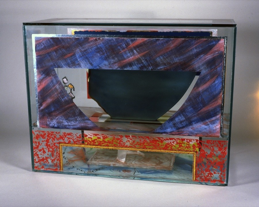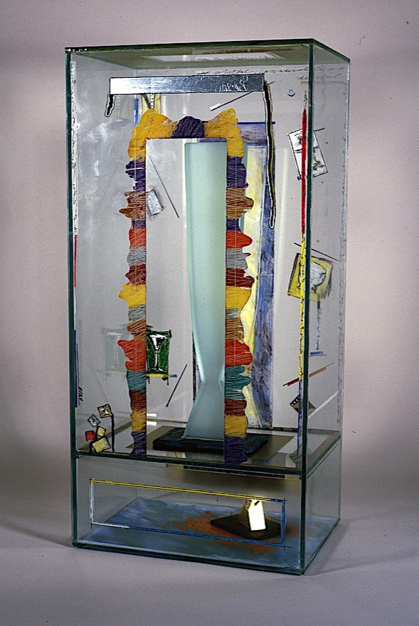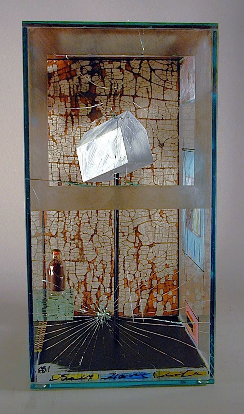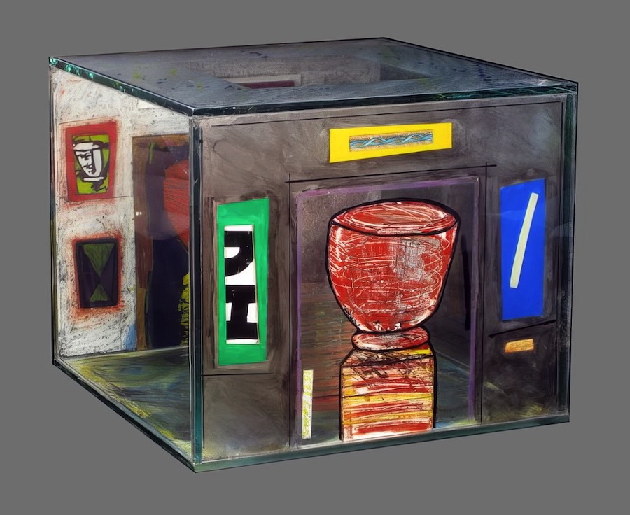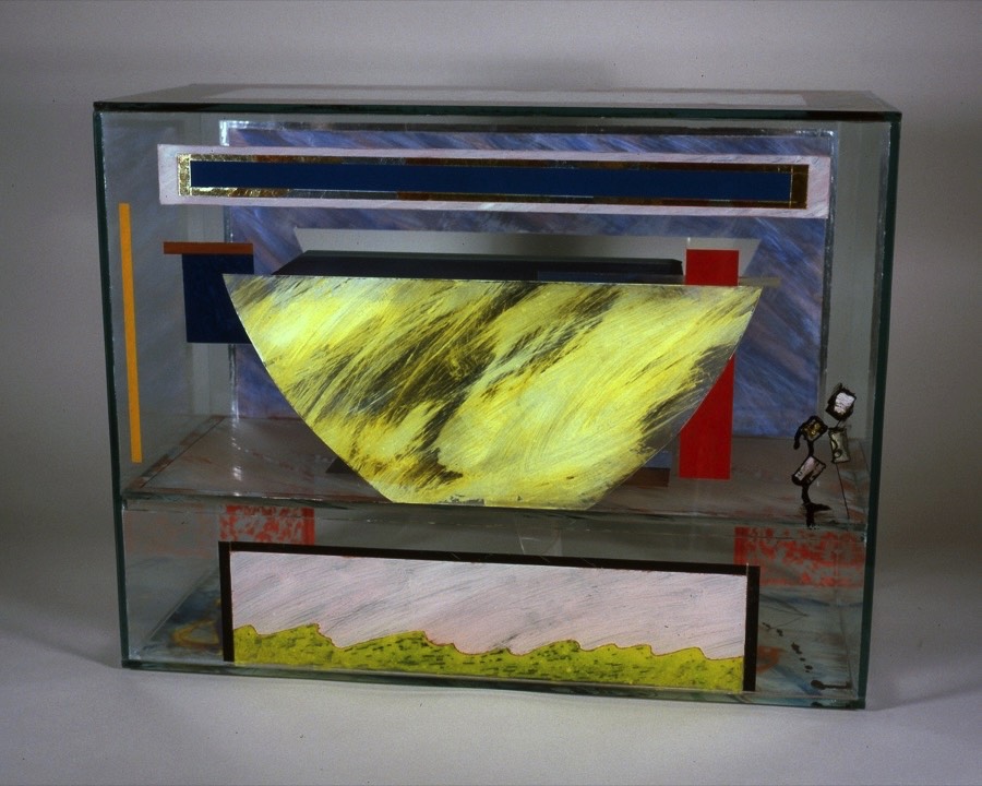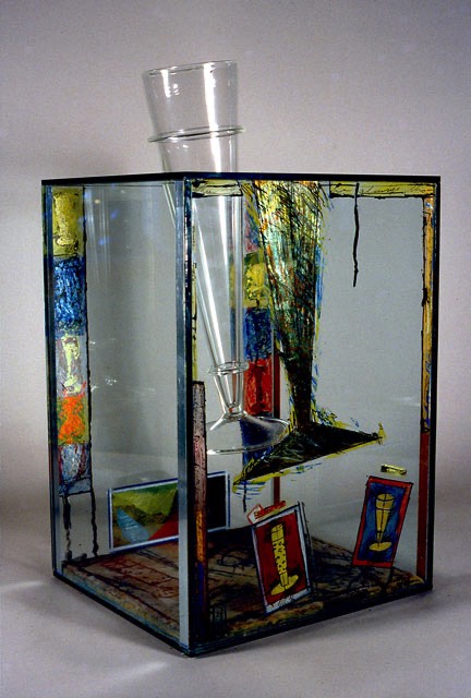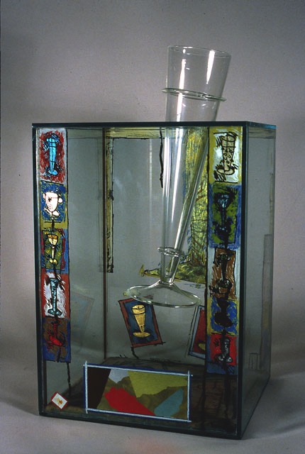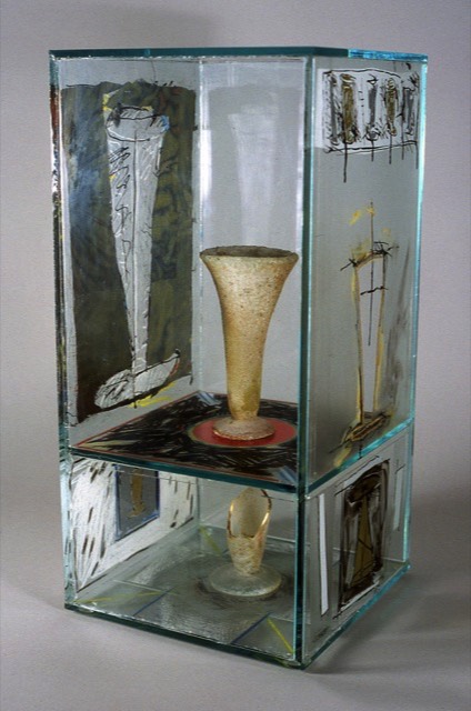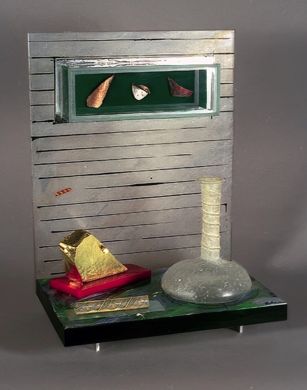 The boxed Environments function as exercises in composition. Some are surreal, combining vessel forms with remnants one might encounter in a glass studio. Each box is intended to be enigmatic, suggesting an open-ended, dreamlike narrative. At times, they resemble locked museum cases preserving artifacts of lost cultures. In this way, simple everyday objects—when sealed behind glass—take on a sense of value and mystery never originally intended for them. While the viewer may first be drawn to the central object within the box, they soon discover the true “canvas”: the surface of the glass itself.
