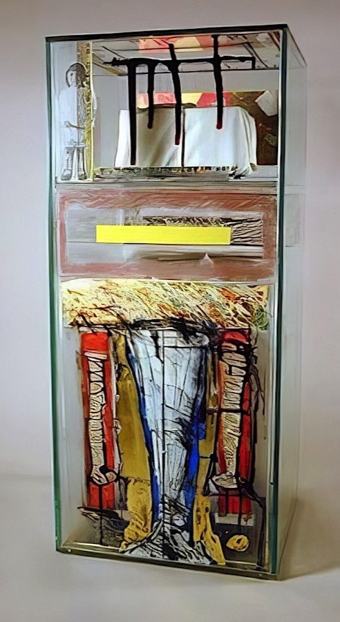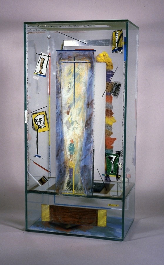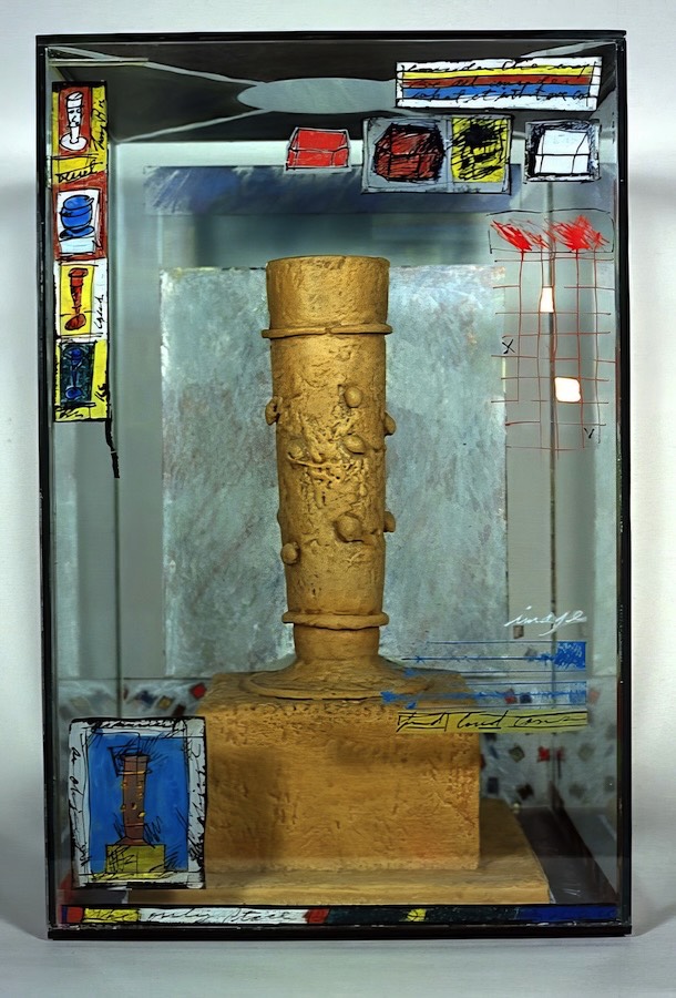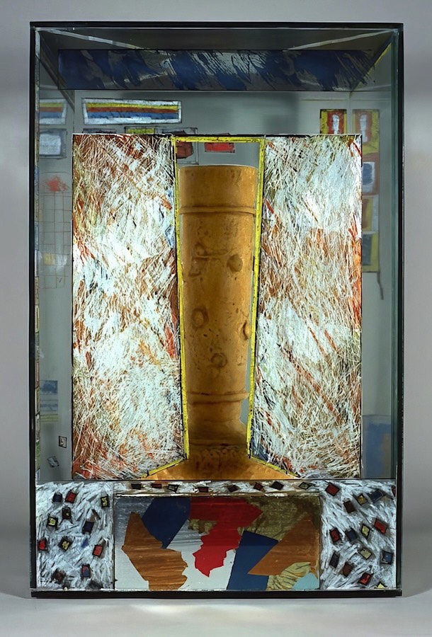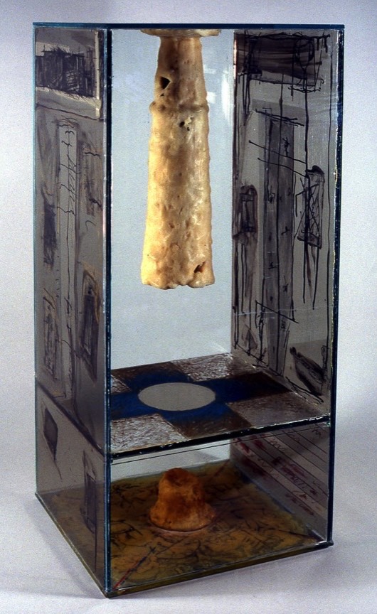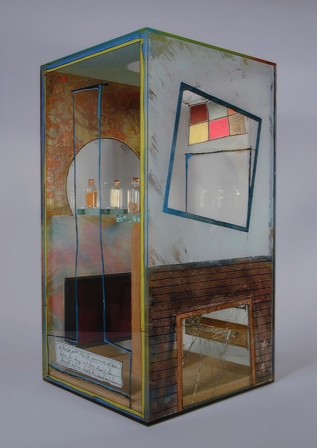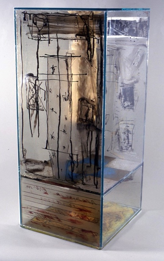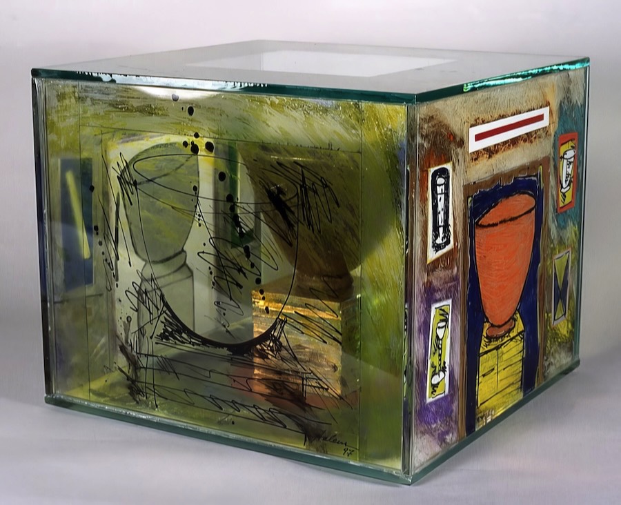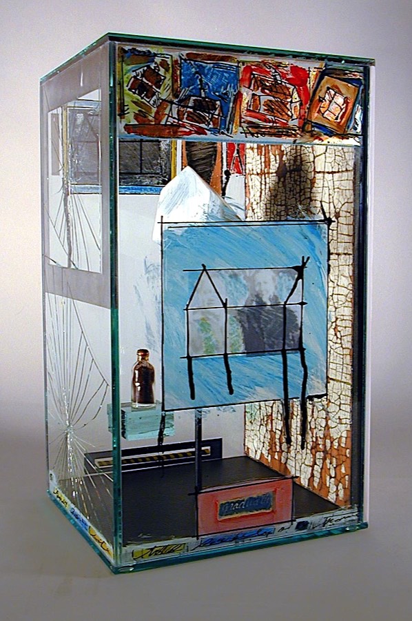 The boxed Environments function as exercises in composition. Some are surreal, combining vessel forms with remnants one might encounter in a glass studio. Each box is intended to be enigmatic, suggesting an open-ended, dreamlike narrative. At times, they resemble locked museum cases preserving artifacts of lost cultures. In this way, simple everyday objects—when sealed behind glass—take on a sense of value and mystery never originally intended for them. While the viewer may first be drawn to the central object within the box, they soon discover the true “canvas”: the surface of the glass itself.