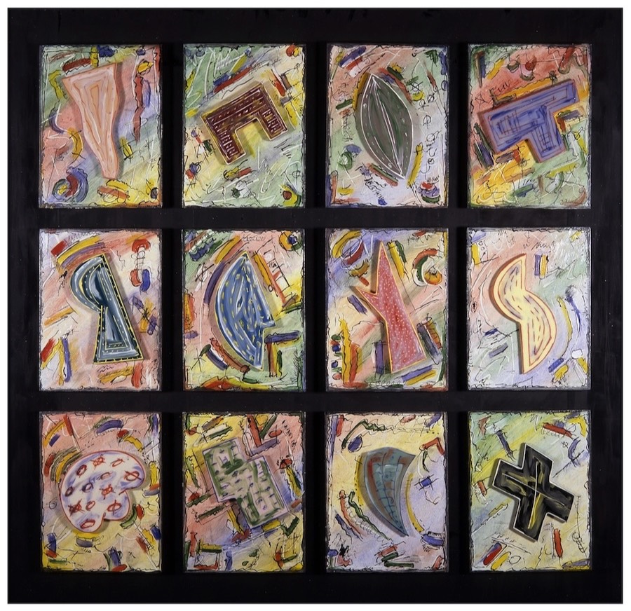 12 Pieces: Fired glass enamels on glass. $2,000. 32 x 31