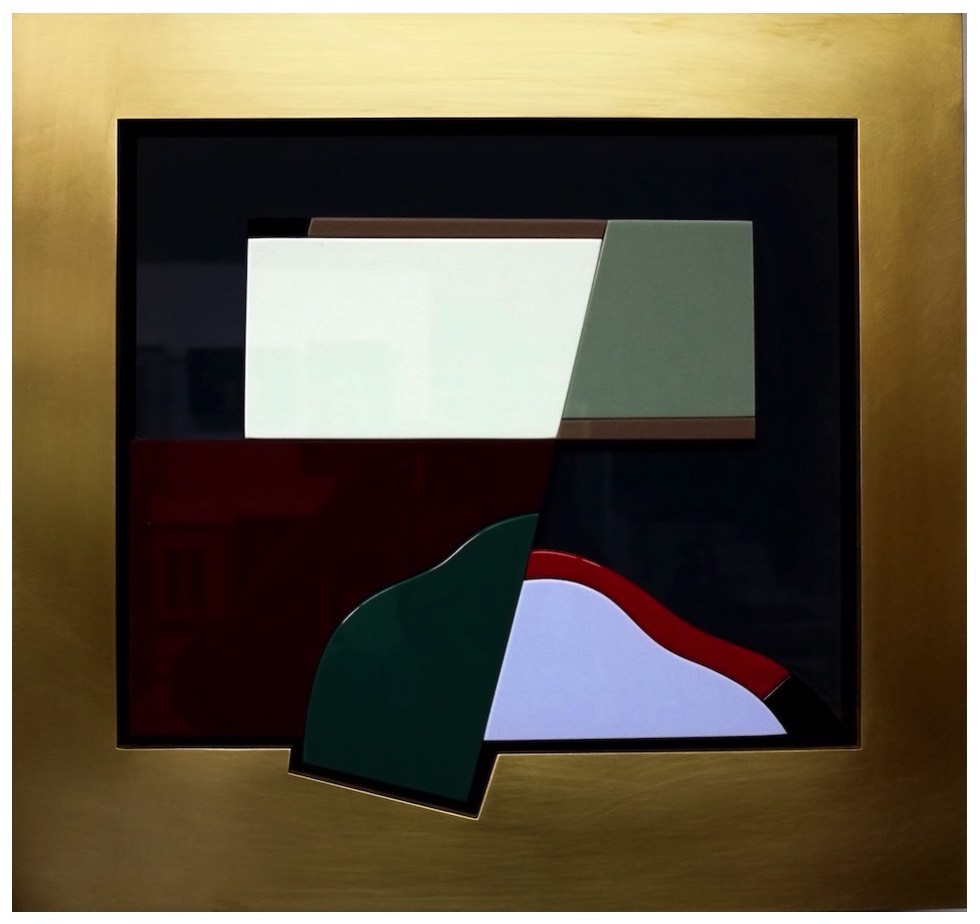 Landscape: Assembled Vitrolite glass, brass frame. $1,750. 18 x 17