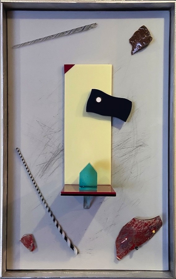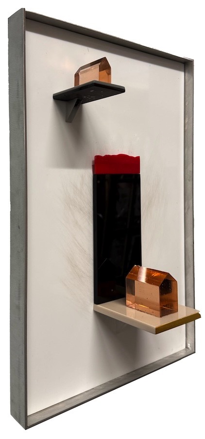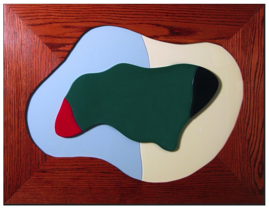 Floating: Assembled Vitrolite glass, wooden frame. $1,550. 30 x 25