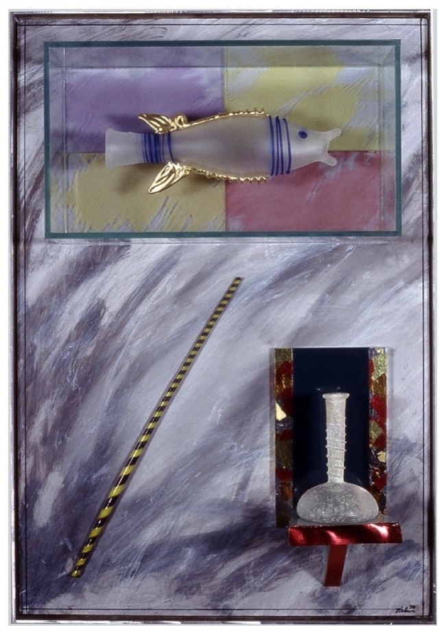 Roman Objects: Blown fish and bottle on acrylic background. $2,000. 17 x 25