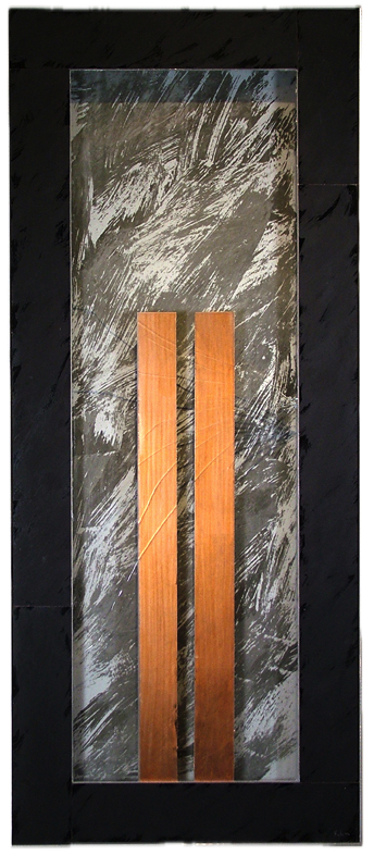 9/11 - 5 Copper leaf, india ink, black glass acid-treated, fractured glass $1,500 14 x 32
